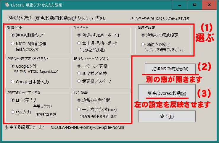 7つの選択肢を選んだ後、「反映/DvorakJ起動」ボタン(反映させてDvorakJを起動/再起動させるという意味です)を押せば、その時から親指シフトを使うことができます。